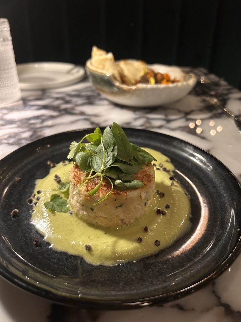 To start our tasting journey, I choose the beef cheek appetizer (something I normally wouldn’t order, but it intrigued me). It arrived on a cloud of hummus with crispy chickpeas, curry oil, and a perfect amount of warm naan to scoop up every last bit. It was rich, tender, and I’m glad I branched out. Next was a crab cake (I’ll try one almost any time it’s on a menu), seared golden over a silky green curry sauce with Thai basil, mint, and cilantro. The fresh herbs lent a nice pop of flavor, and the crab cake itself was delightful.