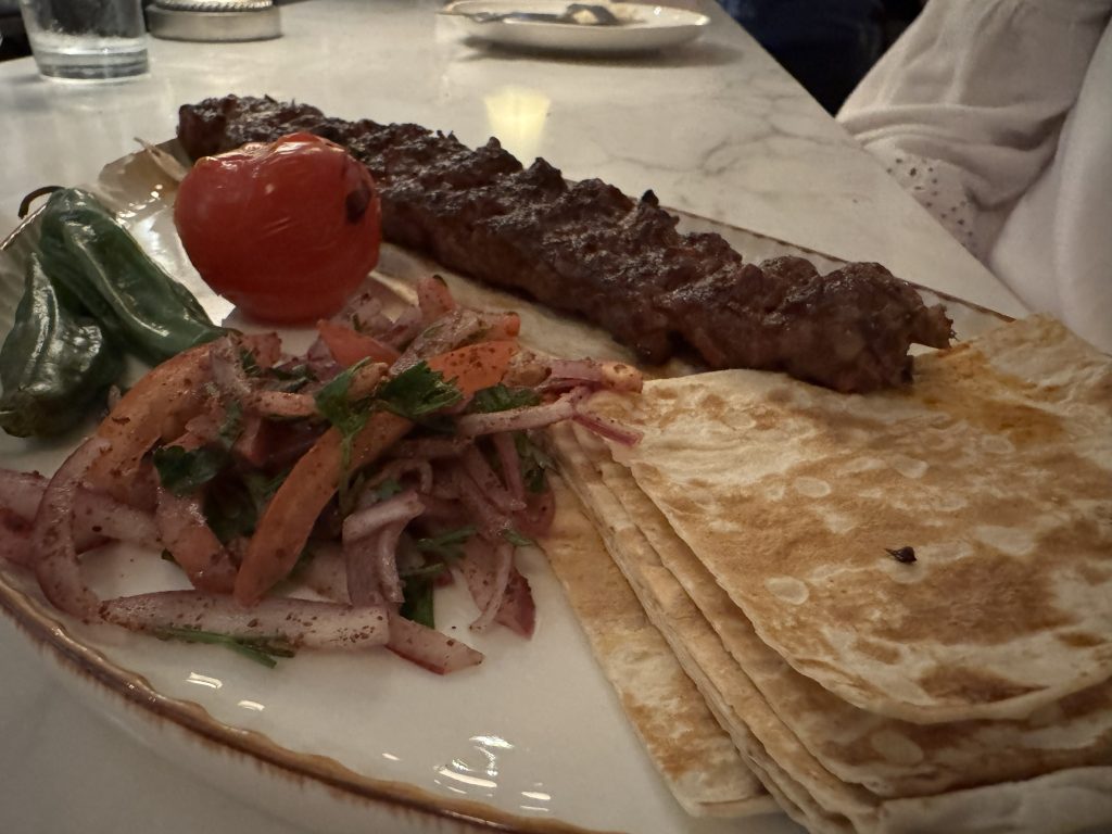 For our entree, we were too full to go for the Bosforo Mix Kebap (kebab) plate featuring the Bosforo kebap, the șiș kebap, and the chicken kebap, two lamb chops, and two köfte. Next time. Damn you, delicious but filling hummus. We settled on splitting the Bosforo Kebap, which the menu says they make only 50 of each evening. This kebap features hand-minced beef, antep, sumac onion, grilled veggies, and lavash. Antep may have jumped out at you; it did for me, and sent me straight to the internet to figure out what this refers to. Antep is a region in Türkiye now known as Gaziantep, which is the source of specific high-quality ingredients, such as Antep pistachios and Antep cheese. Which of these two made it into our kebap I may never know.