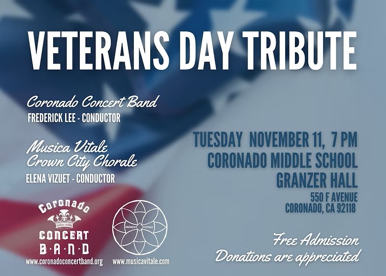 Tuesday evening I attended the Coronado Salute to Veterans Concert. For all who missed it, the Coronado Concert Band, Musica Vitale, and the Crown City Chorale presented a wonderful concert and salute to veterans. The band has a great, big, glorious sound. The combined Musica Vitale and Crown City Chorale were inspiring. In addition to the musicians, two veterans shared their stories. Both of them emphasized how much the concert with an appreciative audience meant to them.