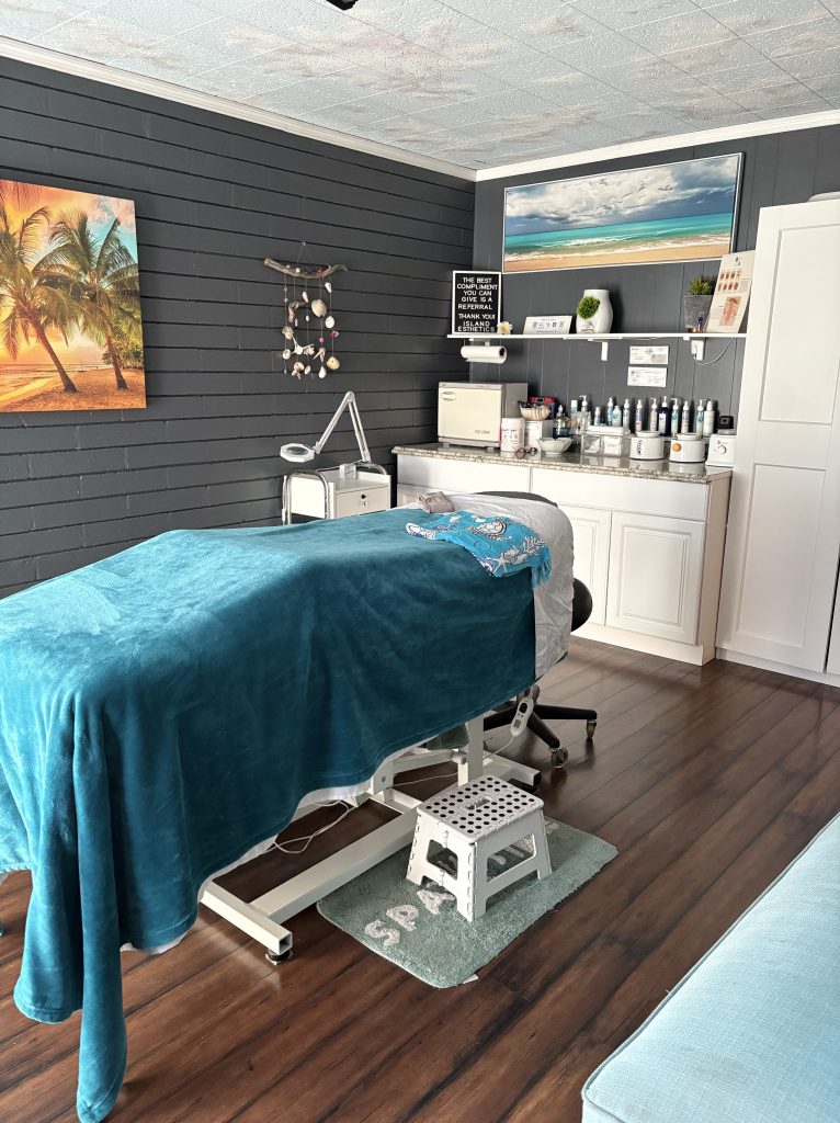 Home Inside Island Esthetics: customized skincare, sugaring, and sustainability Island Esthetics office bed