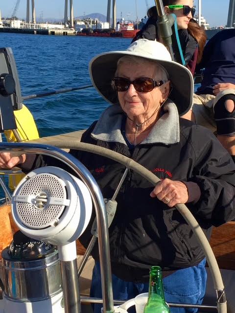 Even in her nineties, Ruth embraced adventures of all kinds. Here she is seen at the helm of a sailboat, going under the Coronado Bridge.