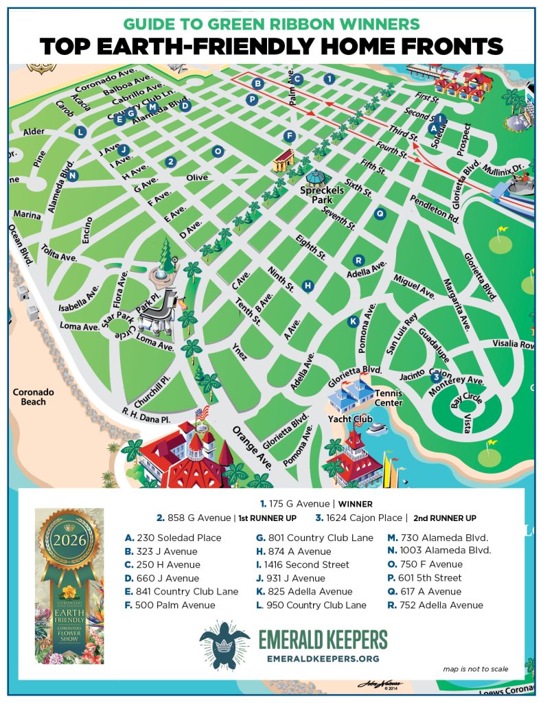 Thank you to the volunteers recognizing Coronado’s earth-friendly home fronts: Abby Berk, Bill Berk, Aila Breslauer, Beth Breslauer, Greg Breslauer, Tim Chin, Alison Downton, Julia Elassaad, Lori Ganem, Trey Gregory, Dave Landon, Diane Lindsay, Anna Little, Allison Logan, Carlotta Molotto, Laura Plumb, Dawn Richards, Karen Rodgers, Trisha Ross, Clay Shinn, Martina Schimitschek, Amy Steward, Anne Stockdale, Kessler Tillner, Caroll Warren, Lisa Wastila, Zarrina Young.