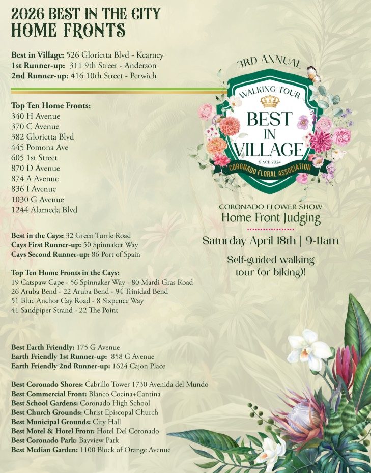 Every spring, Coronado’s front yards become a quiet competition of color, texture, and care. The Coronado Floral Association is proud to announce this year’s Home Front Judging winners — and to invite the community to celebrate them in person. A free self-guided walking or biking tour through the island’s award-winning gardens is part of the 104th Coronado Flower Show weekend (April 18-19).