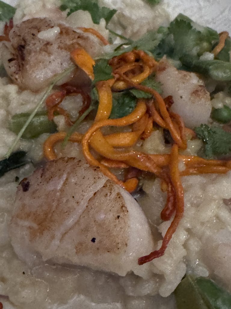 Hokido Scallops over green curry coconut risotto.