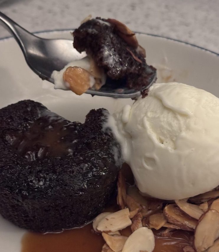 Toffee Cake dessert with bay leaf and olive ice cream.