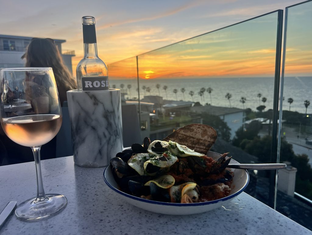 The meal we had was amazing. We overdid it with the appetizers. Our first round was Beef Tartare & Bone Marrow: creme fraiche, grilled Fresno chili, shallot, cornichons, and grilled sourdough. Then we tried the Miso Cured Hamachi: wasabi pea furikake, avocado, yuzu ponzu, finger limes, and cilantro. We had a seat on the glass and wanted to make it last, so we ordered yet another appetizer, the Mussels: red tomato sauce, pickled onions, parsley, and more grilled sourdough. The sun began to set.