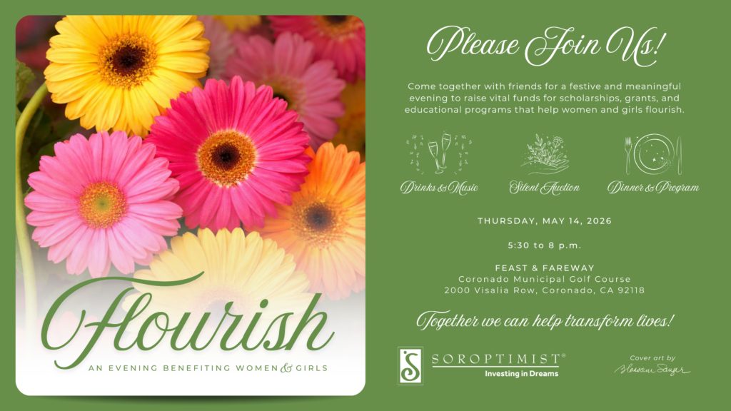 The Coronado Soroptimist club invites long-time supporters and all fellow community members for this festive and meaningful evening — an opportunity to connect, celebrate, and raise vital funds for scholarships, grants, and educational programs that help women and girls flourish. There will be food, drinks, and a silent auction.