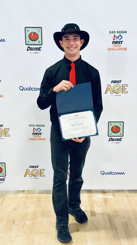 Coronado High School junior Reed Karosich is being recognized on a global stage after earning the prestigious FIRST Dean’s List Award — one of the highest honors in student robotics.