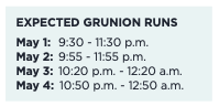 The California Department of Fish and Wildlife posts schedules of expected grunion runs before each season although the schedule varies for different San Diego beaches and some nights the grunion are a no-show.